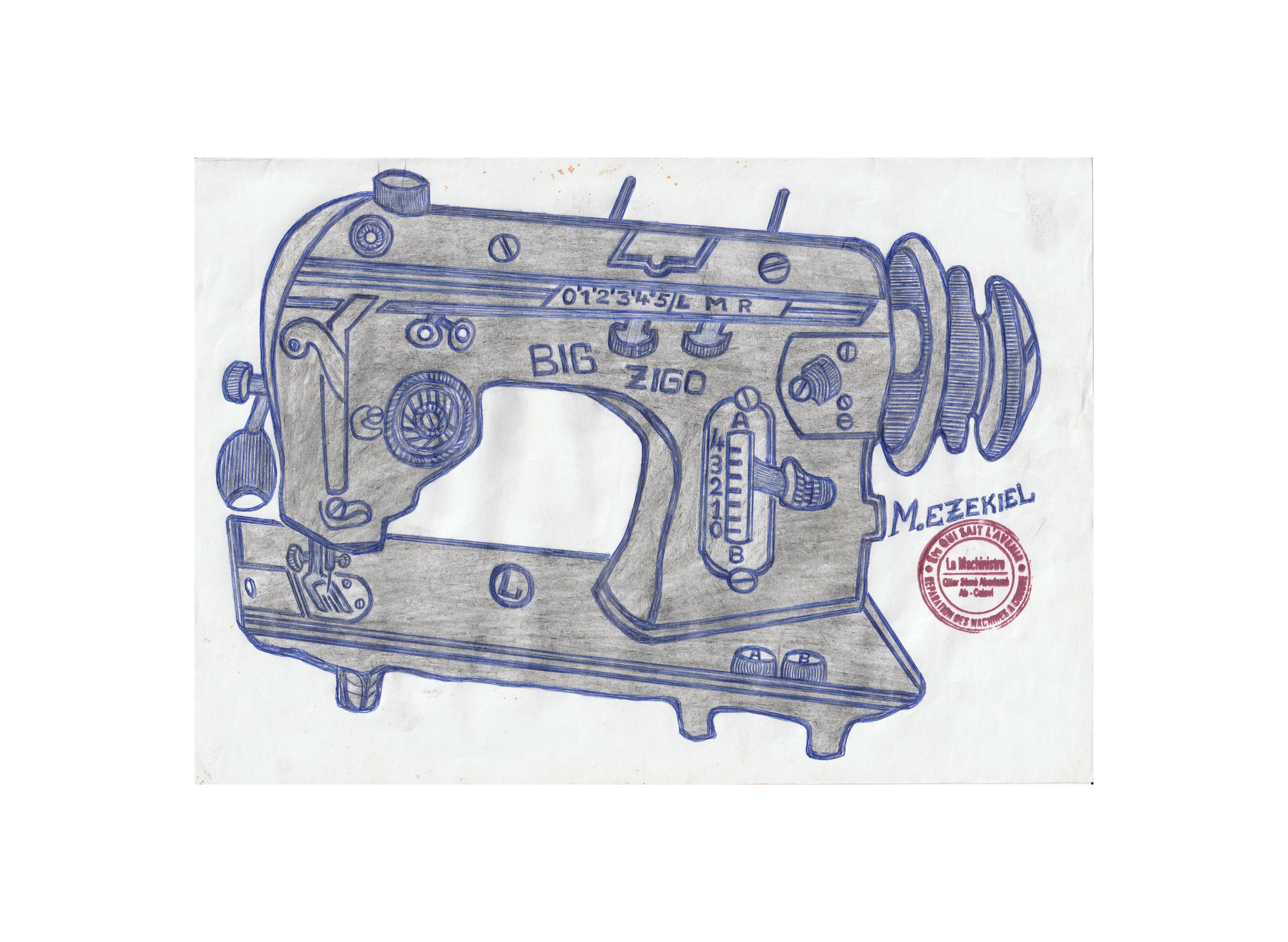 Élève peu assidu, Ezekiel Messou fuit, à seize ans, un père autoritaire et part s’installer au Nigeria. De 1990 à 1995, à Lagos, il apprend à réparer les machines à coudre. Comme il le dit, « les pêcheurs, les tailleurs ou les maçons sont trop nombreux sur le lac, alors que personne ne saurait faire ce métier…» Aujourd’hui, il vit avec deux femmes et ses dix enfants et possède son propre atelier de réparation de machines à coudre dans une petite ville du sud du Bénin. Dans son arrière-boutique, à l’abri des regards, il remplit des cahiers d’écolier et des feuilles au format A4 inventoriant des modèles de machines à coudre. Ces premiers dessins adoptaient le style rigide des schémas techniques, aujourd’hui Messou permet à sa main de laisser éclore de ses machines des formes qui évoquent un bestiaire aux courbes végétales. Une fois le dessin achevé il signe M. Ezekiel et appose le tampon de son établissement à l’encre rouge ou bleue : « Ets qui sait l’Avenir * Réparation des Machines à Coudre * Le Machiniste ». Ce tampon certifie, pour lui, qu’il est bien l’auteur de l’œuvre, une sorte de copyright : « personne ne peut me voler mes dessins ».